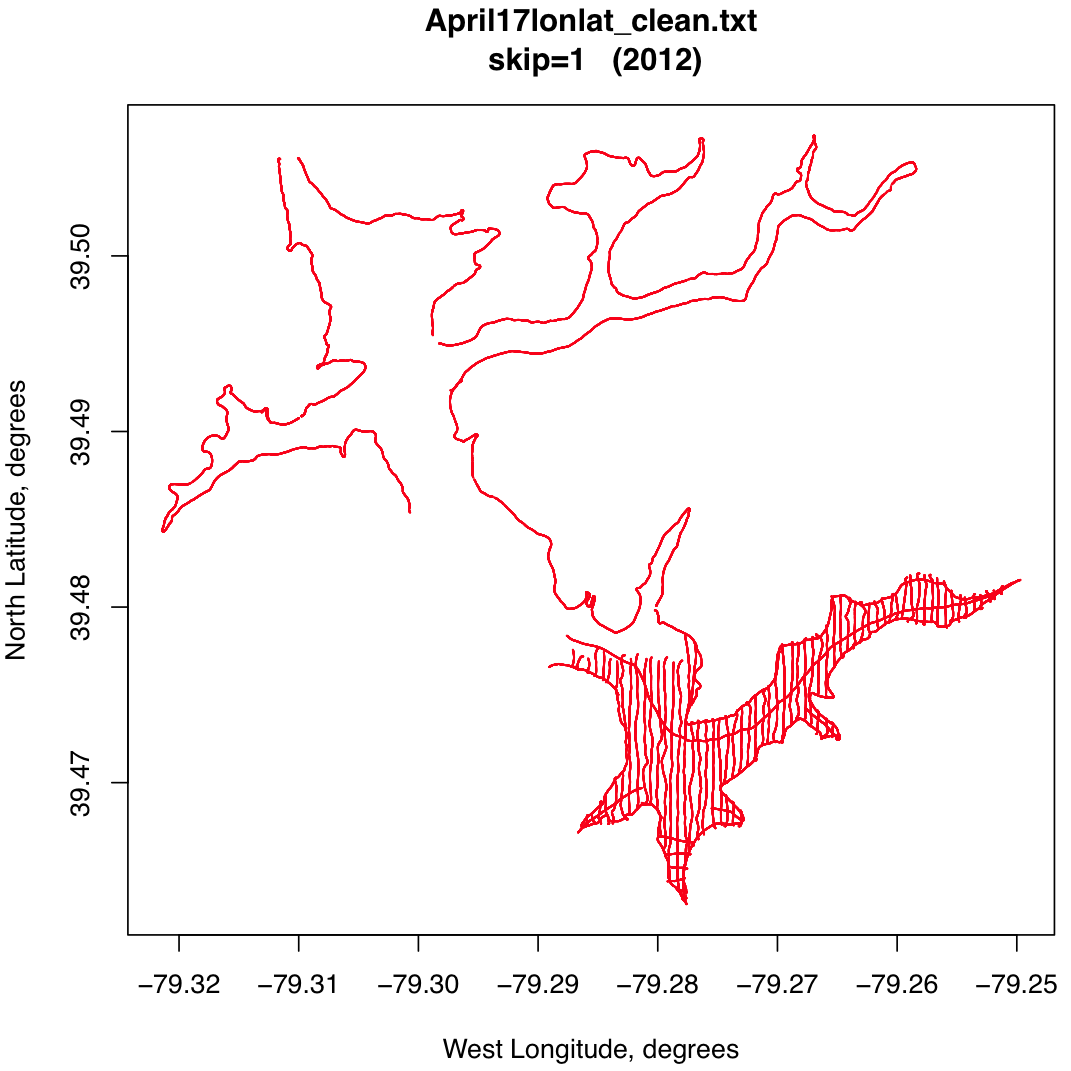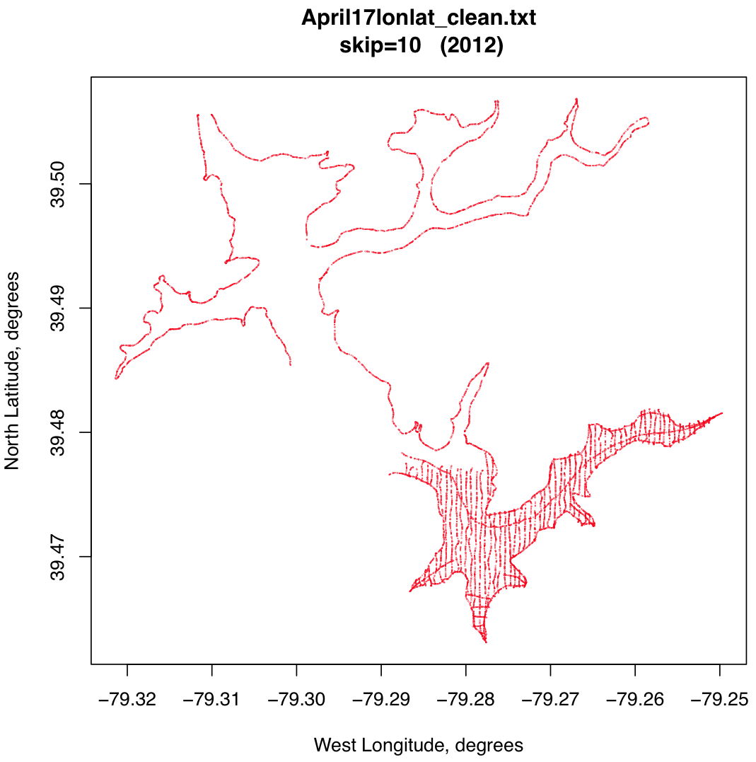 I figured that the data must exist in some digital form somewhere, but I could not locate it. Neither the MDE or DNR, who should have it, nor Lake Management, nor the County had the data. After years of on and off searching I finally was able to locate a copy of an AutoCad file containing the 2462 surveyed contour. It took some doing to get the actual coordinates off the proprietary format, but this was eventually accomplished via a web service that was able to convert the file to an ESRI shape file. With "R" I could then process the shape file and extract the coordinates of the 2462 ft contour in meters, and easily transformed to feet. That data file can be downloaded from the deepcreekscience.com website.