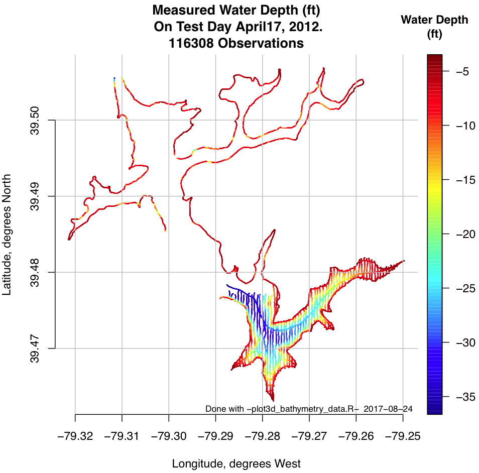 The original bathymetric work was performed in 2012. The result of that work is presented on the deepcreekanswers.com website. The purpose of the work was to identify what boat slips would get into trouble at lower water levels. Getting into trouble means that boats would get stranded when the water level dropped too much because of operations conducted by the Deep Creek Hydro power generating facility. The process on how I got to those maps will be updated and described in detail here.
