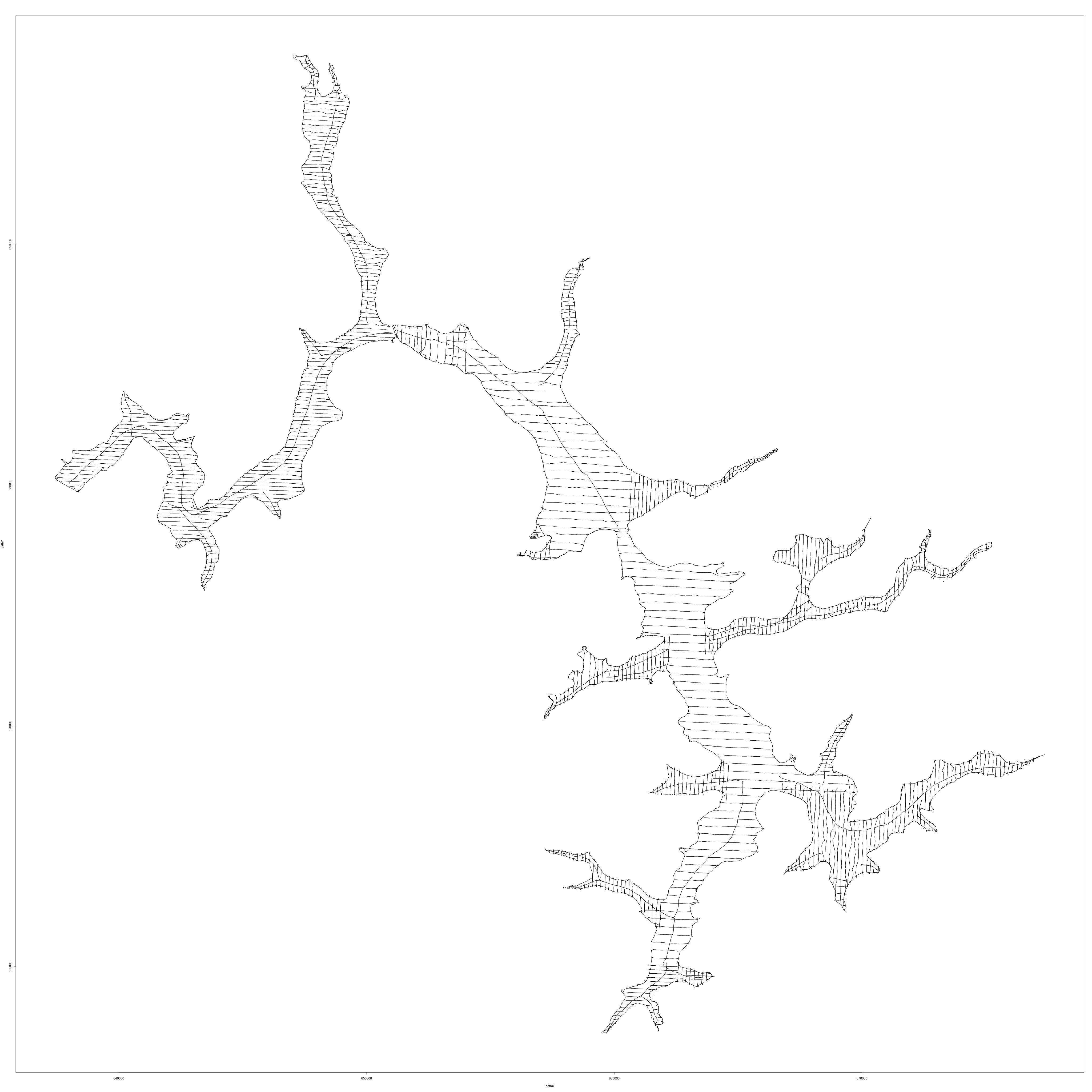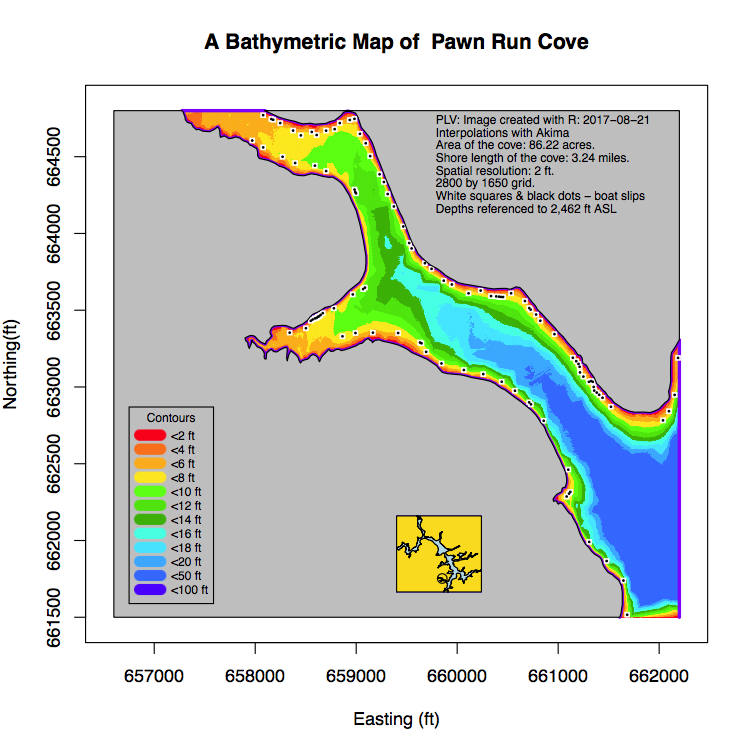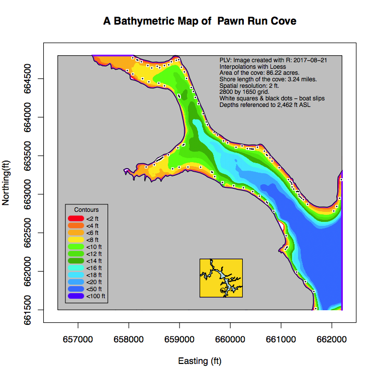 Over the years "R" has become a very powerful spatial data manipulation system; spatial data means defining attributes, such as buildings, roads, signs, etc., at locations on earth. Hence a simple script could be constructed that would transform the latitude/longitude coordinates of the bathymetric data to Northings/Eastings, the term used to designate simple x/y coordinates with respect to some fixed reference an plot them over the the lake shoreline.