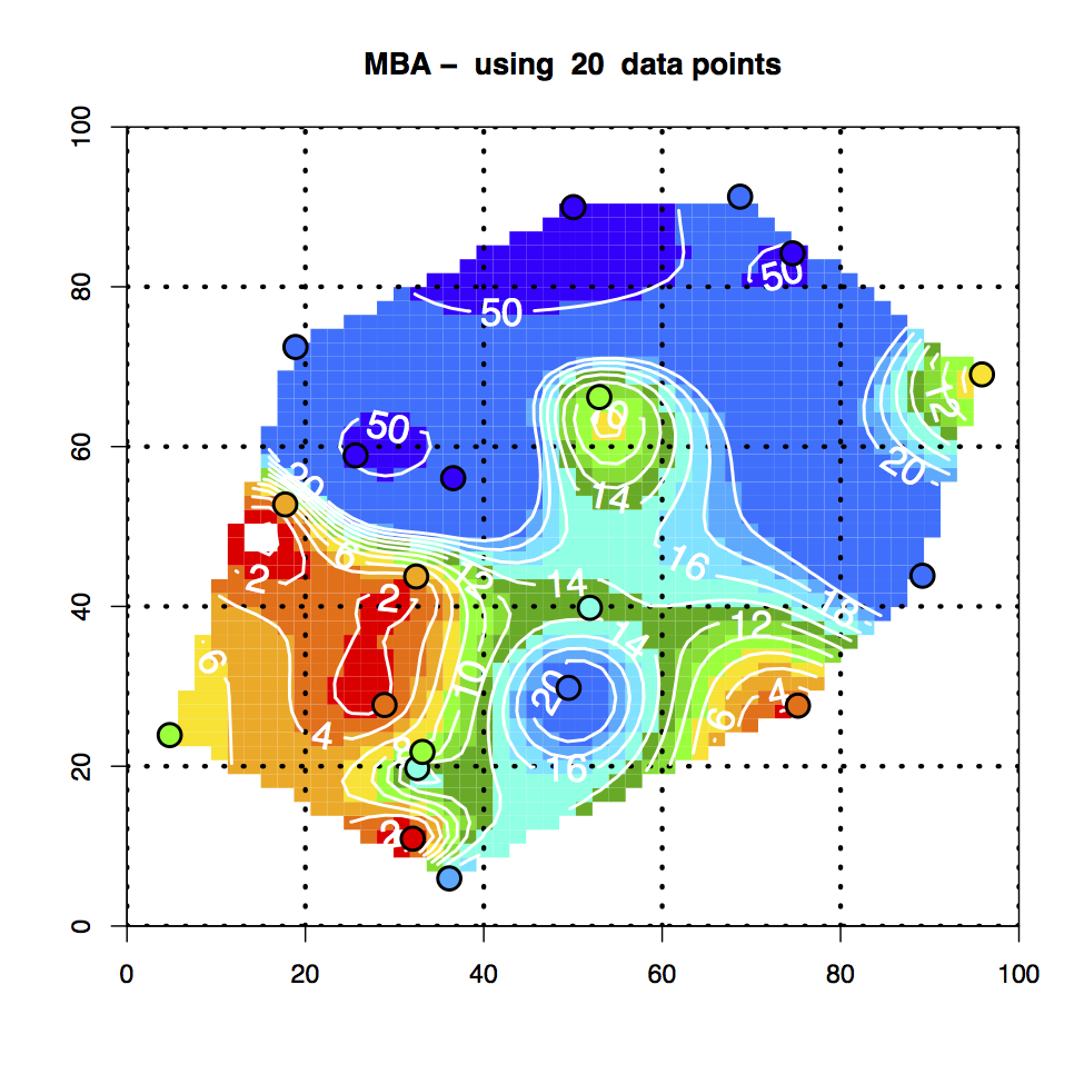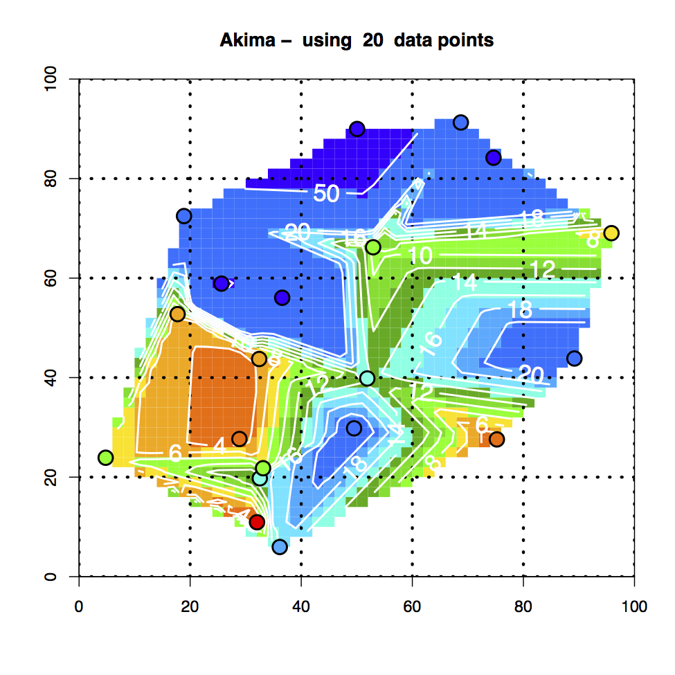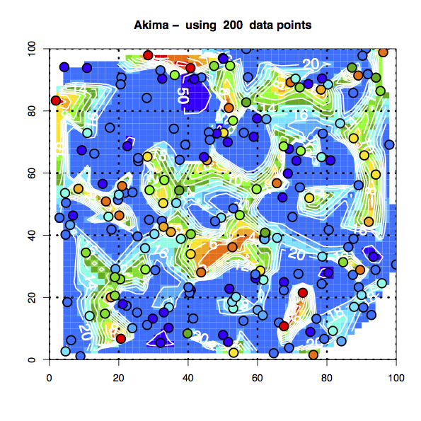 In addition to the Akima interpolation procedure, I recently found another method in one of the R packages, labeled as MBA (R has thousands of functions collected in hundreds of packages and, because of the sheer number of them, its easy to miss some very useful ones).