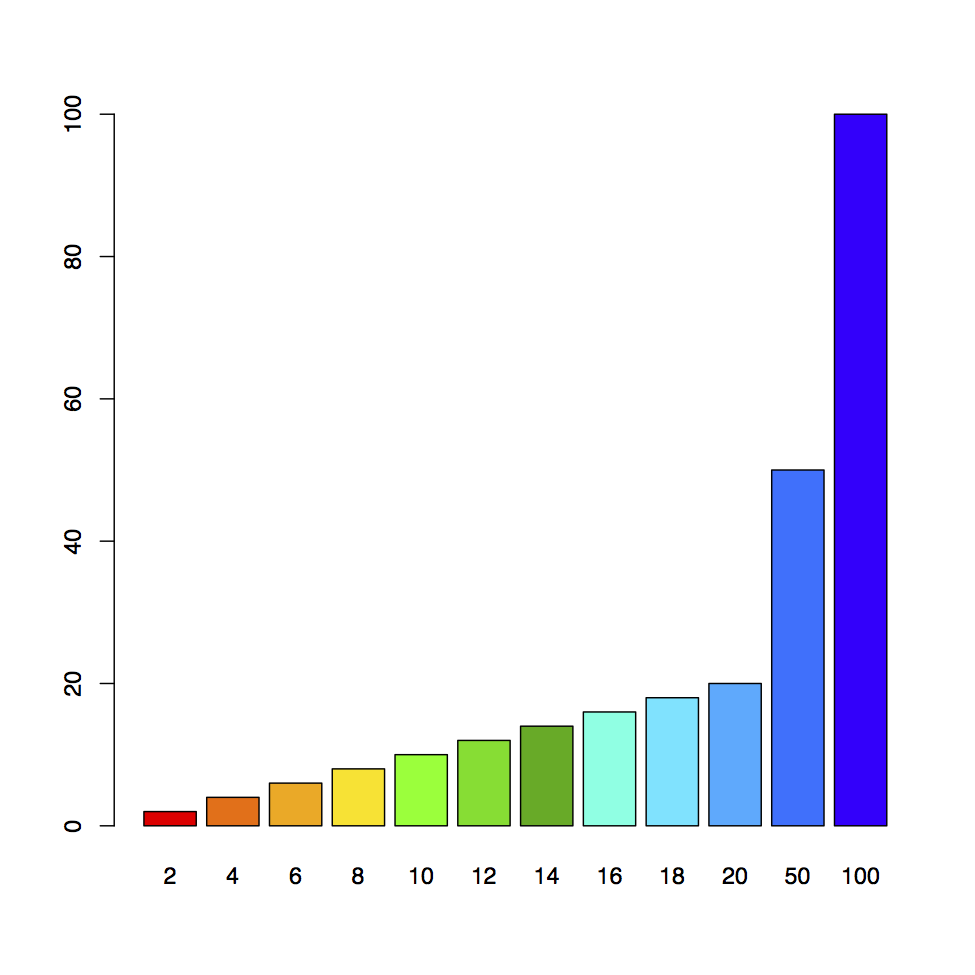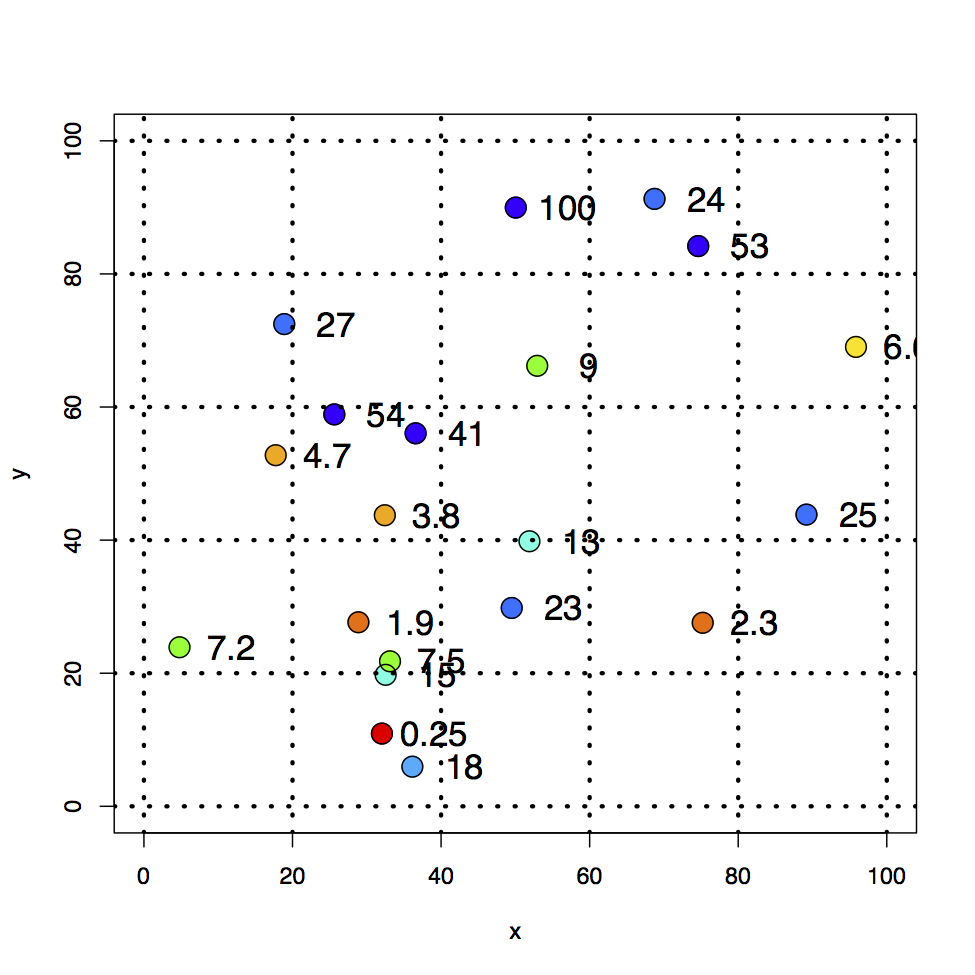 I defined a grid of 100 x100 ft or miles, or whatever; units do not matter. For that grid, I computed a random set of x,y coordinates and z values. For ‘x’ and ‘y’ they were selected from a uniform distribution between 0 and 100, for ‘z’ they were selected from a normal distribution with the resulting values normalized to 100, equivalent to the maximum depth value used in all of the bathymetric work.