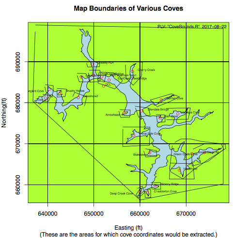 Originally trying to produce a single bathymetric map of the lake was impossible because the desired resolution, around 5ft or less for a cell size, required a lot of computer memory and the corresponding file size became huge. This also made a single computer run excessive time consuming. Because only certain coves were of interest, it was decided to focus on those coves. The data requirements were less and computer run times were short and hence a lot of trial and error could be conducted to generate the ultimate desired maps. Ultimately, detailed bathymetries were generated for approximately 40 coves or areas of interest.